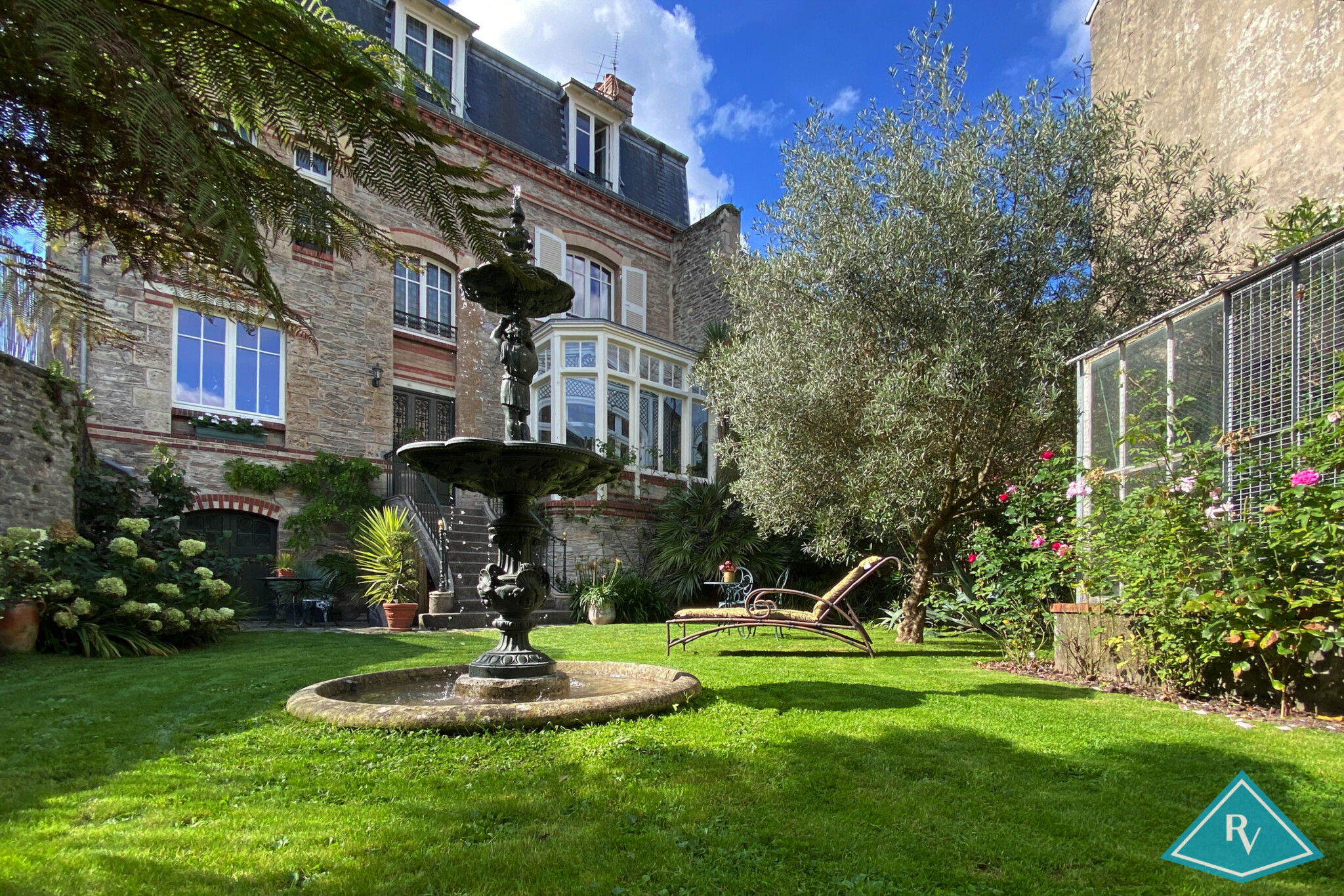 Extérieur : Très beau jardin, parfaitement exposé, arboré et clos avec fontaine rénovée et ancienne serre transformée en volière.