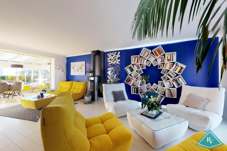 RDC : Entrée avec sanitaire indépendant, cuisine aménagée et équipée s’ouvrant sur l’agréable séjour avec poêle à bois, lui-même ouvert sur la véranda aménagée en salle à manger lumineuse.