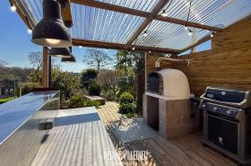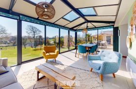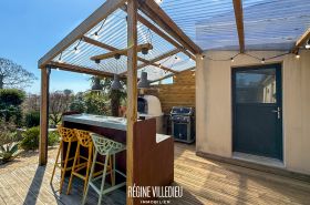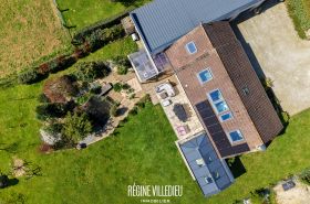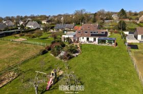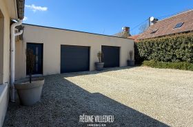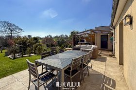 Triple garage accessible par la maison, portail motorisé, cour, jardin arboré, terrasse avec four à pizza, panneaux photovoltaïques.
