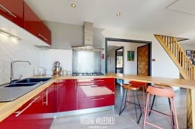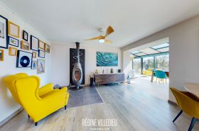Au rez-de-chaussée : belle entrée desservant deux chambres, une cuisine aménagée avec îlot central, salle de séjour avec poêle à bois, salon et véranda , sanitaires, salle d’eau, buanderie.