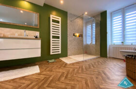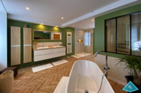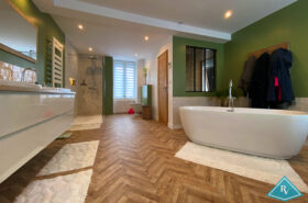 Au 1er étage : L’escalier recouvert d’un jonc de mer vous emmènera sur un palier distribuant l’étage « suite parentale » avec parquet massif, dressing et magnifique salle de bain de 19 m² dans laquelle baignoire ilot, douche à l’italienne et sanitaires.