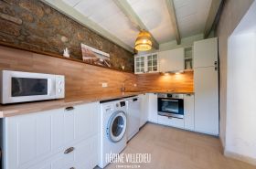 Le second gîte, situé sur la gauche, propose un salon/salle à manger lumineux avec poêle à granulés, ainsi qu’une cuisine aménagée et équipée.