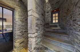 Escalier en pierres, palier desservant une grande pièce de vie, une cheminée décorative, une cuisine semi indépendante équipée,