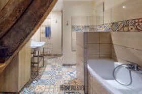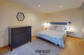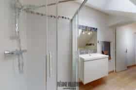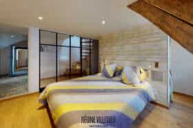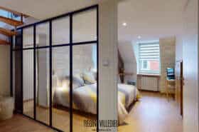 A l’étage : chambre avec beau parquet et salle d’eau privative et sanitaires et une autre chambre avec verrière, une salle de bain avec douche, baignoire et WC, dressing